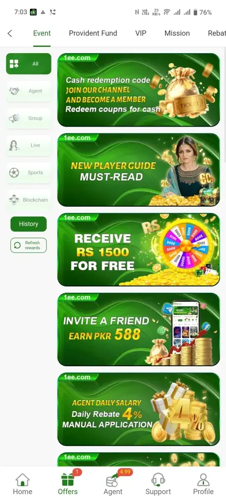1ee game is a secured and fair gaming platform which offers it’s players a good variety of games like slot games, card battles, skill based matchmaking and rummy style games to play and in return earn real money along with daily bonuses, rewards and promotions that may include welcoming rewards, daily login bonuses, referral bonuses,and sesonal events bonuses.