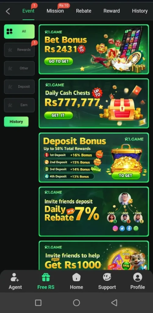 K1 game is an online gaming platform that is offering you best earning opportunities along with exciting games to play like casino style games, slot games, card games, mini games, lotteries, sports betting, skill based games, luck based games and many more. Select the games that suits your gaming skills and tastes and play them wel to earn real money as well as daily bonuses, rewards, credits and promotions. Use these bonuses to boost your earnings later. These bonuses include welcoming bonuses, daily login bonuses, referral bonuses,first deposit bonuses, sesonal events bonuses and many more. Claim them carefully and use them later to increase your earnings.