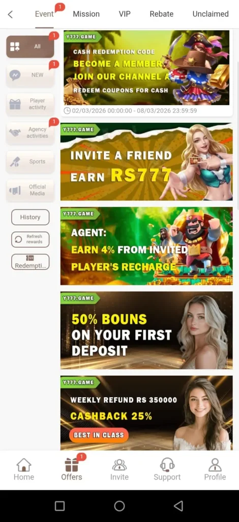 Y777 is an online gaming opportunity that is not just giving you game varieties but also earning opportunities. It is offering huge game varieties that include casino games, slot games, card games, mini games, lotteries, skill based games, luck based games,color predictions and many more. Select the game that is according to your gaming skills and play the game to earn real money in return.